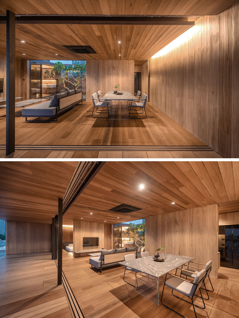 خانه چوبي داراي ديوارهاي شيشه اي زيادي است ، داراي يک اتاق نشيمن باز و يک اتاق غذاخوري است.