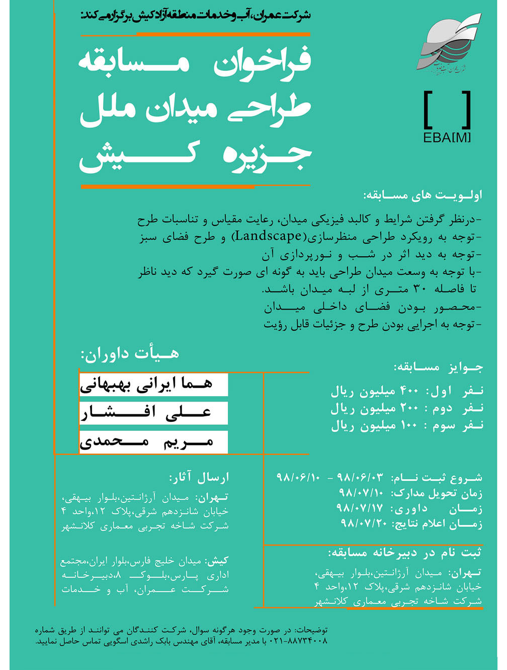 مسابقه طراحي ميدان ملل جزيره کيش، از سوي معاونت فني و عمراني شرکت عمران، آب و خدمات منطقه آزاد کيش با همکاري شرکت شاخه تجربي معماري کلانشهر و با هدف دست يافتن به ايده هاي برتر برگزار مي شود.