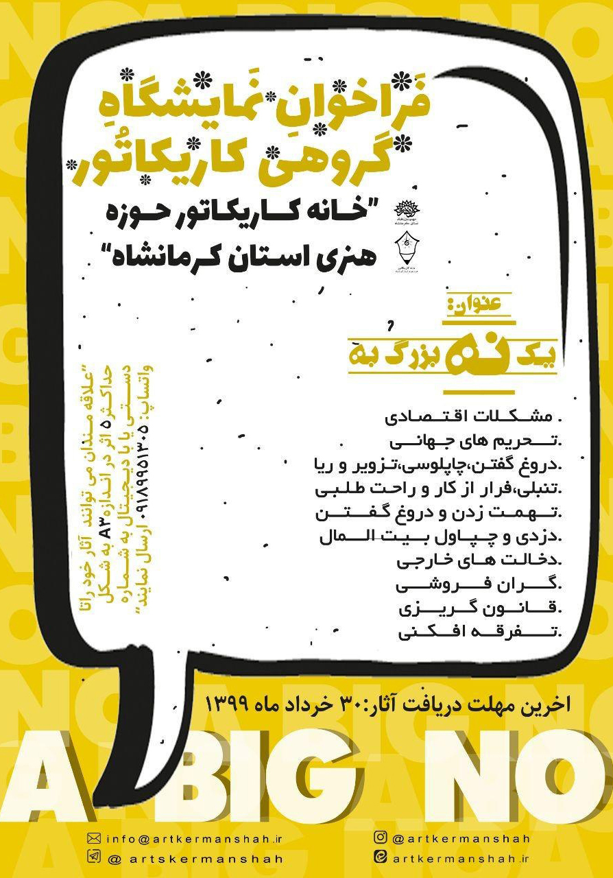 فراخوان نمايشگاه گروهي کاريکاتور خانه کاريکاتور حوزه هنري کرمانشاه با عنوان: «يک نه بزرگ / Abig no » به مشکلات اقتصادي، تنبلي، راحت طلبي و فرار از کار، گرانفروشي، تفرقه افکني و…منتشر شد.
