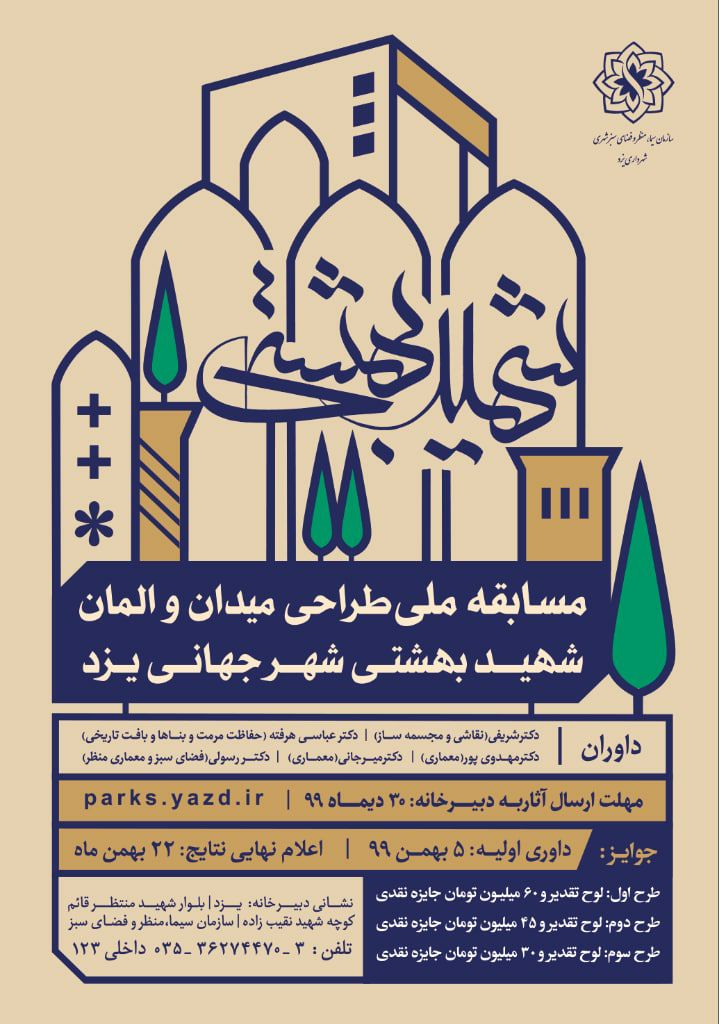 سازمان سيما منظر و فضاي سبز شهري يزد به منظور بهبود سيماي بصري و هويت بخشي به ميدان شهيد بهشتي سازمان نسبت به برگزاري مسابقه ملي طراحي ميدان و المان شهيد بهشتي شهر جهاني يزد براساس آيين نامه ي جامع برگزاري مسابقات معماري و شهرسازي و با هدف ايده هاي اصيل معماري ايراني اسلامي و تفکرات خلاقانه جديد و ايجاد آثار فرهنگي و هنري ارزنده و ماندگار، از طريق ايجاد رقابت سالم اقدام نمايد.