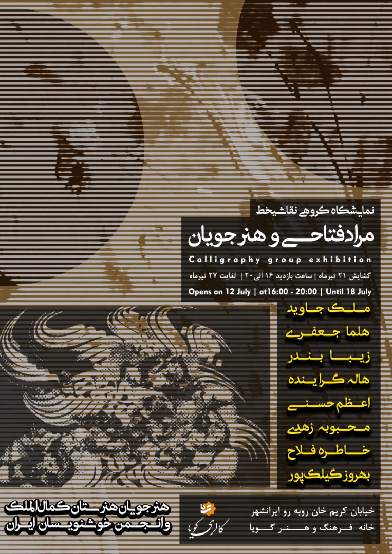 نمايشگاهي از آثار نقاشيخط مراد فتاحي و هنرجويانش از روز جمعه 21 تيرماه در گالري گويا در معرض ديد عموم قرار مي گيرد.