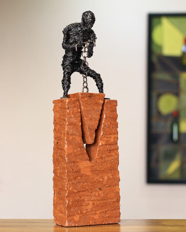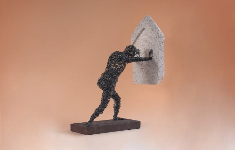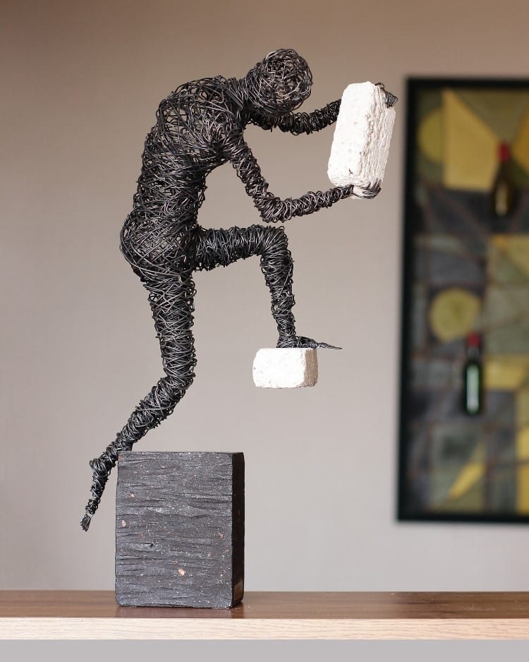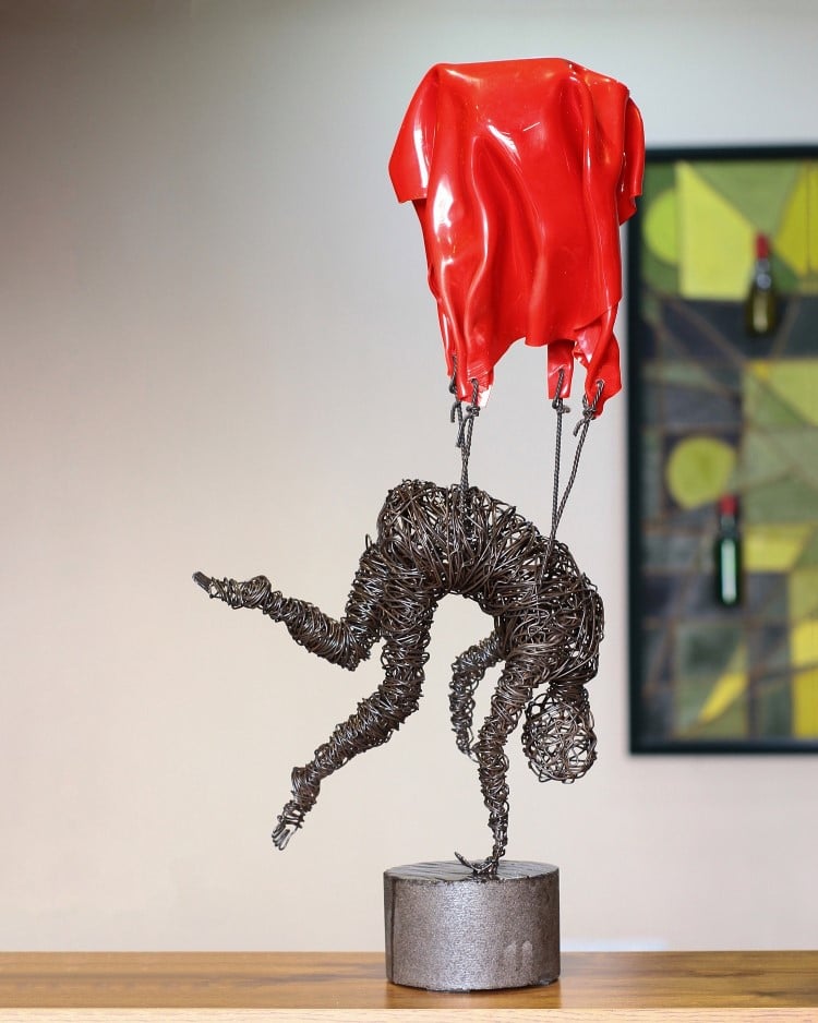 او در برخي از مجسمه ها از متريال هاي ديگري مانند توفا، نوعي سنگ آهک، که محبوبيت خاصي دارد استفاده کرده است. در حالي که سنگ کنتراست فوقالعادهاي با فلز ايجاد ميکند، فيگورها آن را هل داده، از آن بالا مي روند و يا حمل مي کنند. در يکي از مجسمه ها با نام "جاذبه صفر"، او چتر نجات به رنگ قرمز روشن را از پلکسي گلاس ساخته است که با ظرافت فيگور در حال سقوط را نگهداشته است.