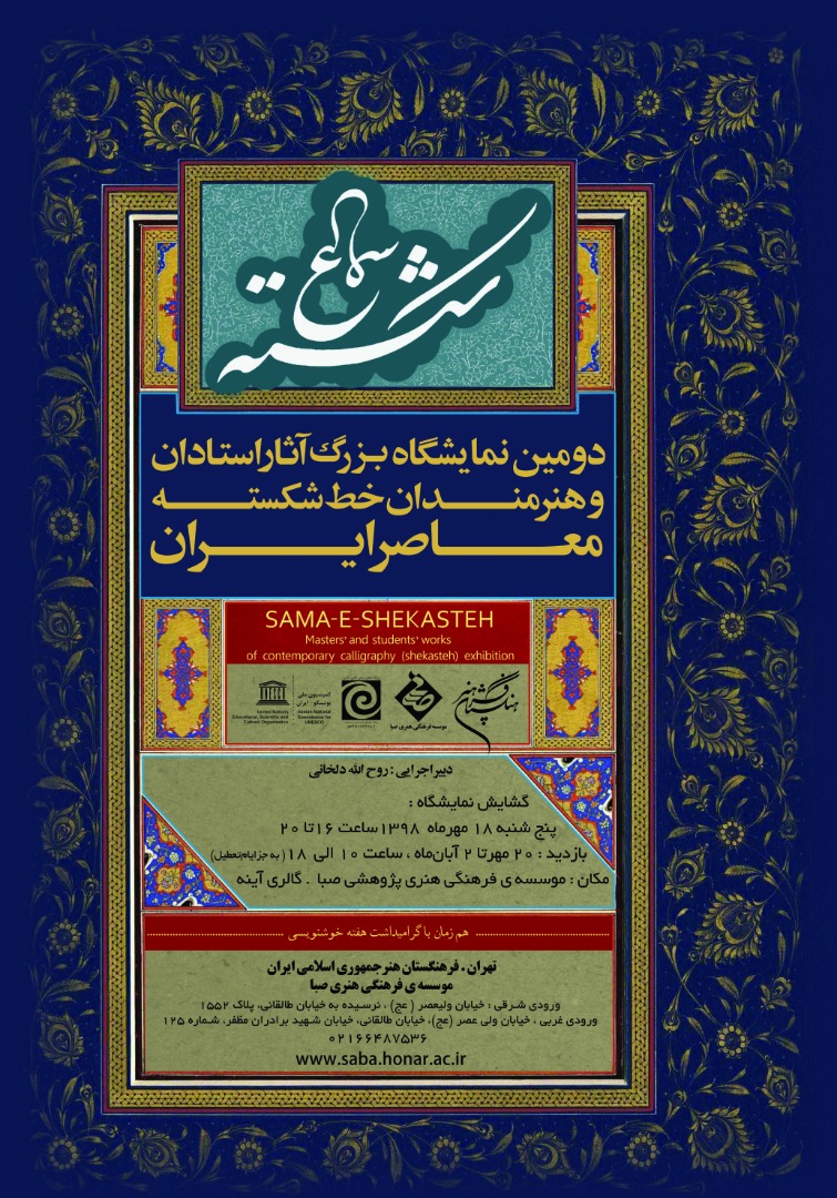 دومين نمايشگاه بزرگ آثار استادان و هنرمندان خط شکسته معاصر ايران هم‌زمان با گراميداشت هفته خوشنويسي در موسسه صبا برپا خواهد شد.