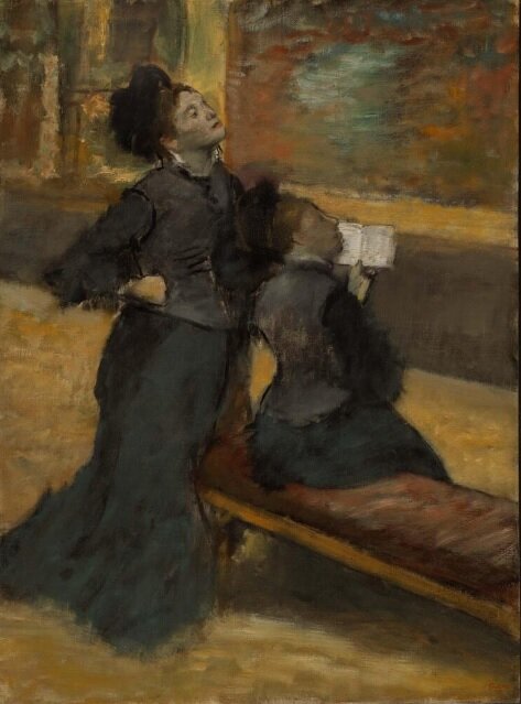 چه صحنه مدرني است! دو زن که نقاشيهايي با قابهاي طلايي در موزه را تحسين ميکنند. يکي از زنان کتاب راهنما در دست دارد و ديگري گويي حين تماشاي آثار هنري در افکار خود گم شده است. افرادي که در اين نقاشي به تصوير کشيده شدهاند در حقيقت «مري کسات» و خواهرش هستند. «کسات» نقاش و يکي از اعضاي جنبش «امپرسيونيسم» بود.
