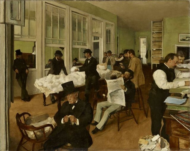 «ادگار دگا» تنها نقاش فرانسوي امپرسيونيستي بود که به ايالات متحده آمريکا سفر کرد و در آنجا نقاشي کشيد. در سال ۱۸۷۳ ميلادي او از اعضاي خانوادهاش که در ايالات متحده آمريکا بودند، بازديد کرد و تابلو نقاشي «دفتر پنبه» را در جريان اقامت در آنجا خلق کرد. اين نقاشي فضاي داخلي شرکت عموي «دگا» در نيواورلئان را به تصوير ميکشد. در اين نقاشي عموي «دگلا» به همراه برادران او و چندين کارمند اين شرکت را حين کار يا شايد هم لحظهاي استراحت ميبينيم. در فضاي پسزمينه پنبه خام را روي ميز ميبينيم.