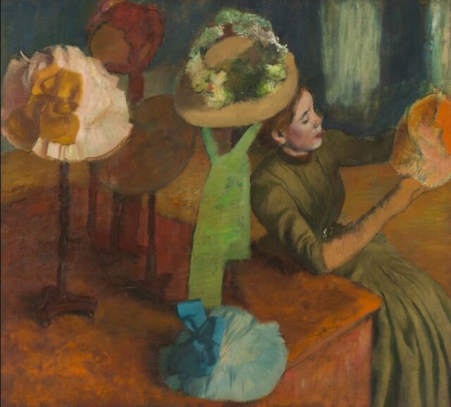 «دگا» در حوالي ۱۸۸۰ ميلادي طراحيها و نقاشيهاي بسياري با موضوع فروشگاه کلاهدوزي خلق کرد. اين نقاشي يکي از بزرگترينهاي اين مجموعه نقاشيهاي است. اين اثر هنري زن جواني را به تصوير ميکشد که کلاهي را تحسين و يا تزئين ميکند. به نظر ميرسد دگا عمداً هويت دختر را ناشناس باقي گذاشته است. آيا او مشتري است يا مغازهدار؟ با بررسي دقيقتر ميبينيم که او يک سنجاق در دهان خود دارد و دستکش پوشيده است. بنابراين شايد او کلاه ميسازد. در کنار زن، مجموعهاي از کلاههاي رنگي نيز به تصوير کشيده شده است.