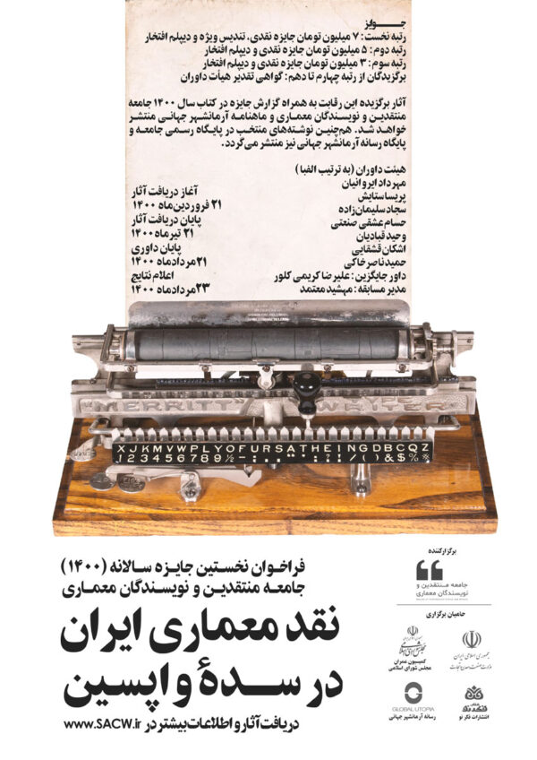 در هنگامهٔ ورود به سدهٔ جديد، لازم است تا با نگاهي انتقادي به معماري معاصر ايران بنگريم و در راستاي کنشگري تخصصي، فراتر از سبکها و سلايق، به بررسي مفاهيم ضروري بپردازيم. جامعهٔ منتقدين و نويسندگان معماري با رويکرد انتقادي نسبت به مسائل شهر و معماري در ديماه سال ۱۳۹۹ آغاز به کار نموده و درصدد است تا با برگزاري فراخوان نخستين جايزه سالانه خود با موضوع «نقد معماري ايران در سدهٔ واپسـين»، بستري را فراهم آورد تا به همافزايي و همانديشي جمعي در اين خصوص منجر شود. اين مسابقه با هدف ترويج فرهنگ نقدپذيري، شناسايي استعدادهاي جوان و طرح آراء بديع در زمينه نقد معماري انجام ميپذيرد و نتايج حاصل از اين رقابت پس از انتخاب دبيرخانه و جهت دسترسي علاقهمندان در پايگاه رسمي و کتاب سال جامعهٔ منتقدين و نويسندگان معماري منتشر خواهد شد.