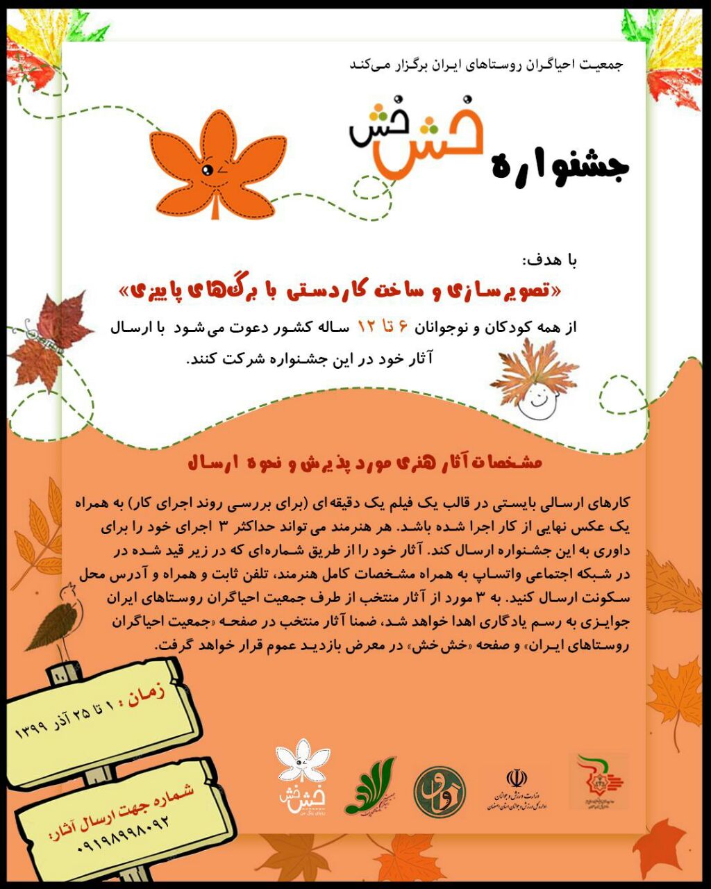 جمعيت احياگران روستاهاي ايران "جشنواره خشخش" را با هدف تصويرسازي و ساخت کاردستي با برگ هاي پاييزي برگزار ميکند.