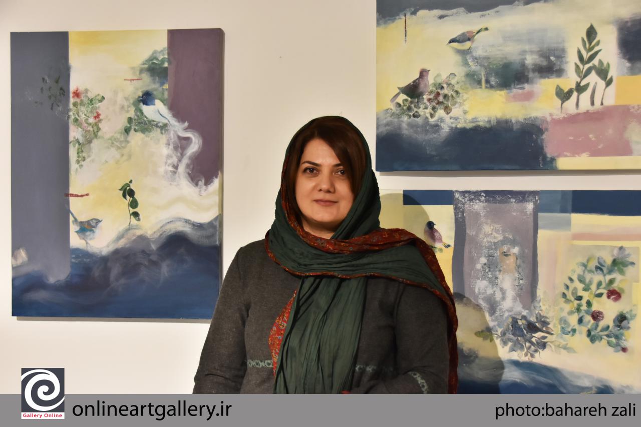 ابعاد چهار عدد از کارهايم 80 در 60 و پنجمين اثر نيز 80 در 80 است. تکنيک مورد استفاده‌ام آکريليک است وکارهايم ذهنيست که بيشتر به سمت آثار مدرن گرايش پيدا مي‌کند. در برخي قسمت‌ها از طبيعت ايده گرفته ام و جايي ديگر نيز نگاهي به نقاشي ايراني(نگارگري) داشتم؛ همچنين،  نگاه شخصي خودم را  با يک سري ترکيب‌بندي‌هاي خاص به کار برده‌ام، در اين دنياي پر آشوب بر اين باورم که اميد وجود دارد و در کارهايم بر اين اساس پيش مي روم.