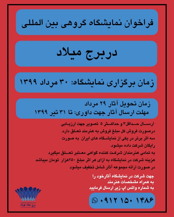 هنرمندان رشته هاي نقاشي، طراحي، عکاسي، حجم، نقاشي خط و ديجيتال آرت ميتوانند در نمايشگاه بين المللي برج ميلاد حضور يابند.
