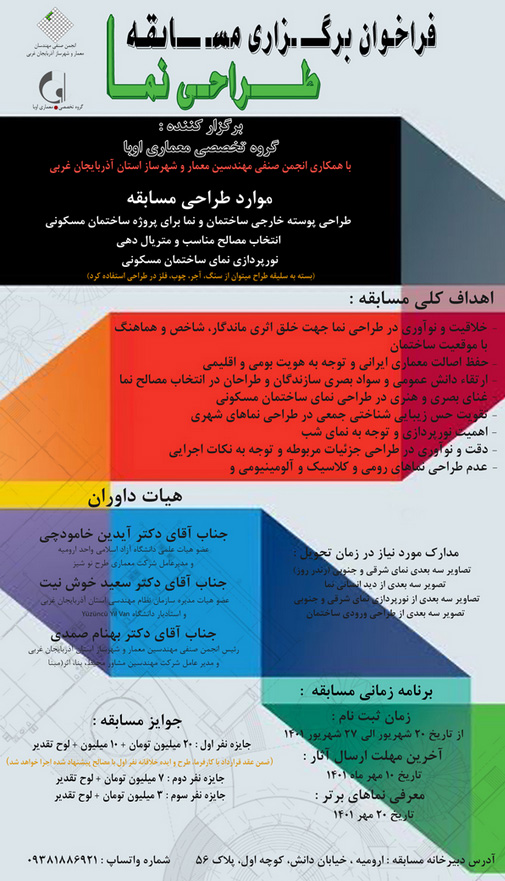 گروه تخصصي معماري اوبا در نظر دارد با همراهي انجمن صنفي مهندسين معمار و شهرساز استان آذربايجان غربي با بهره مندي از ظرفيت جامعه حرفه اي معماري جهت ترويج فرهنگ بکارگيري از مصالح بومي و سنتي در طرح هاي نوين، مسابقه طراحي پوسته بيروني نماي ساختمان مسکوني واقع در شهر اروميه را برگزار نمايد.