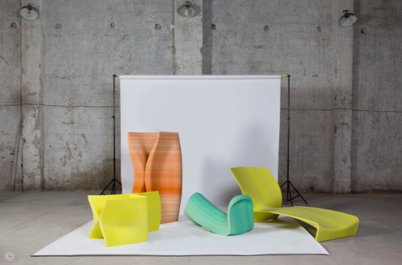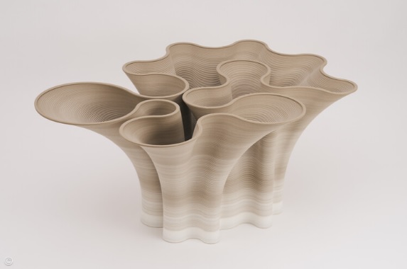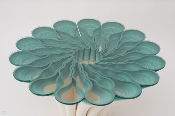 صندلي مواج استفاده از حداقل مواد از امکانات چاپ سهبعدي رباتيک را براي توليد مبلمان سفارشي استفاده کرده است. اين شکل بر اساس يک فرم پيوسته با ضخامت تنها شش ميليمتر و با استفاده از پليمرهاي پلاستيکي پيشرفته چاپ شده است. الگوهاي مواج علاوه بر راحتي، زيبايي چشمنواز آن را نيز تضمين ميکند.