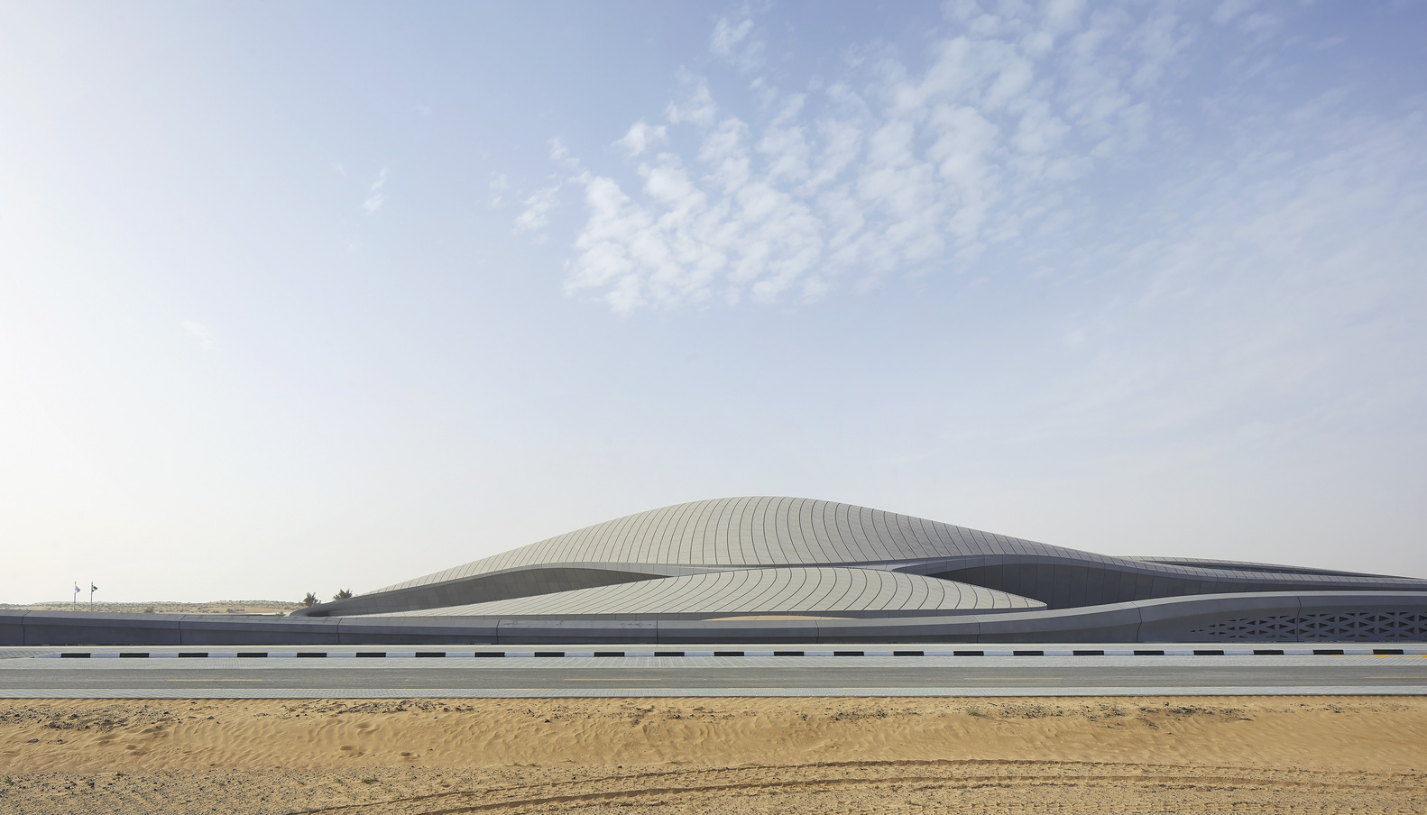 اين طرح که در بافت بيابان السجا شارجه تعبيه شده است، مناظر اطراف را منعکس مي کند که توسط بادهاي غالب به تپه هاي شني مقعر و برآمدگي هايي تبديل مي شود که هنگام تلاقي آنها محدب مي شوند.