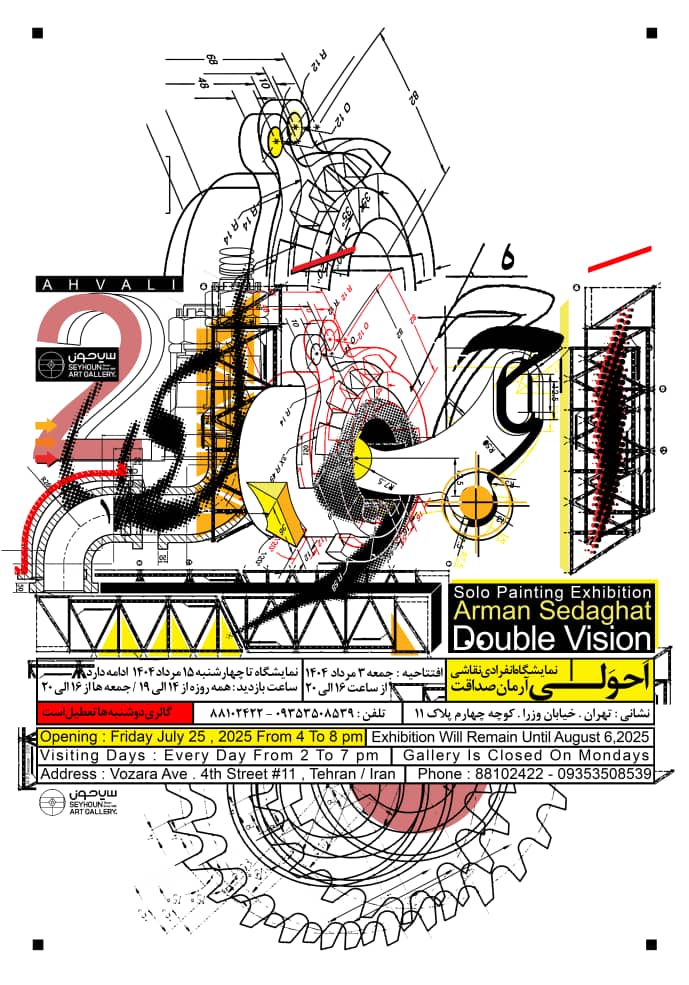 وي در ادامه اشاره ميکند که پيکتوگرامها ــ تصاوير سادهشده و جايگزين زبان ــ همواره برايش جذاب بودهاند؛ چراکه قرار است در کمترين زمان، بيشترين اطلاعات را منتقل کنند. اما وقتي اين تصاوير تکرار يا در هم تنيده ميشوند، بهجاي راهنمايي، نوعي سردرگمي و اختلال ادراکي ايجاد ميکنند. همين ايده، بنيان بصري آثار «احولي» را شکل داده است. فرايند اجراي اين مجموعه بيش از دو سال به طول انجاميده و همچنان ادامه دارد.