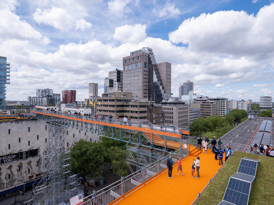 Temporary pedestrian bridges, over 30 meters high and 600 meters long, were spanned over the rooftops of the city of Rotterdam during the Rotterdam Rooftop Festival. They not only offered visitors a spectacular view of the Dutch metropolis, they were also able to explore the city’s unused spaces – and discover the potential of the roofscape to create a more biodiverse, sustainable, and liveable city.