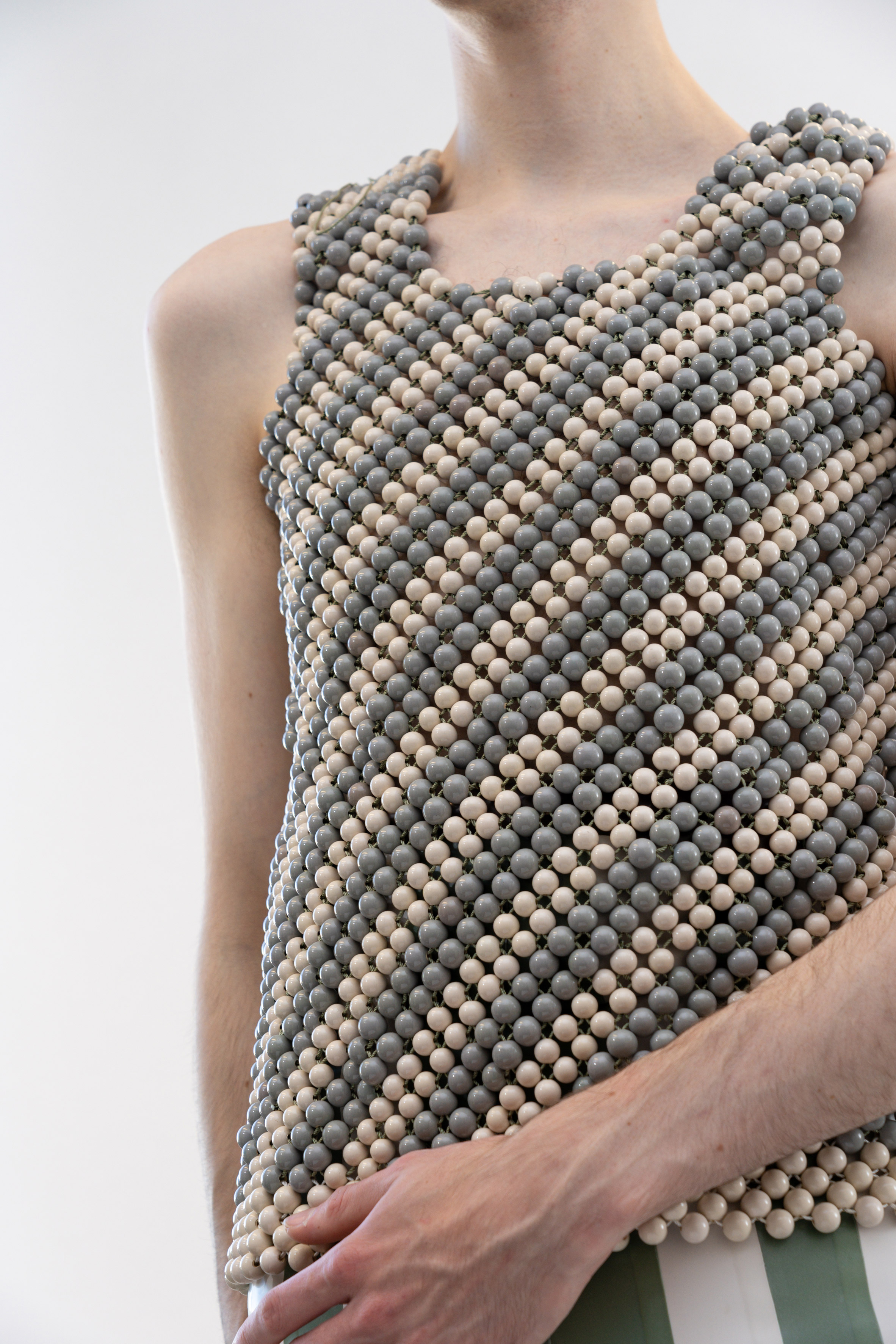 These are variously layered or replaced with tank tops and matching shorts that are strung together from hand-carved wooden beads.