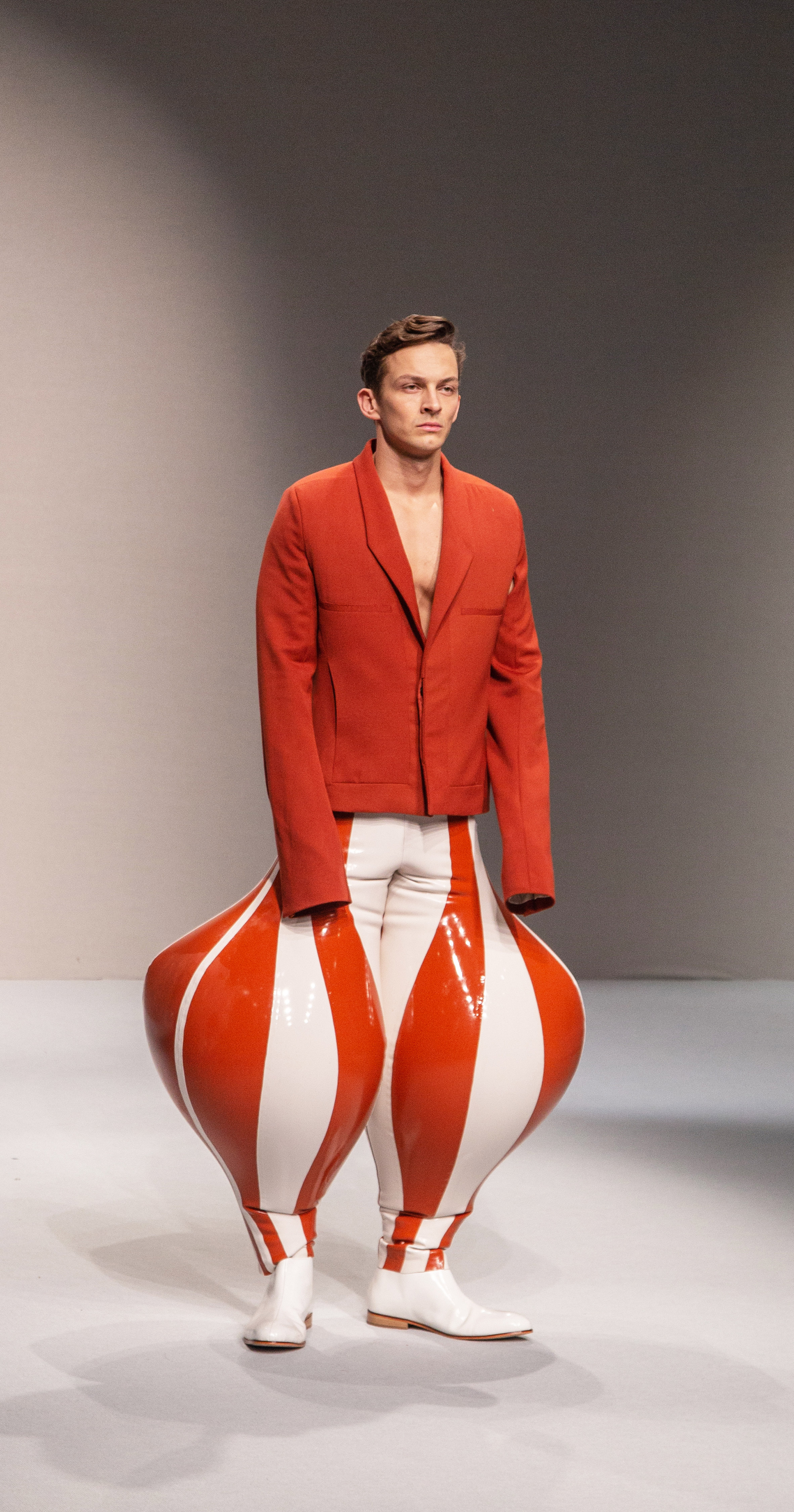 Latex was the perfect material as it stretches and, through its shiny finish, exaggerates the trouser's bulging silhouettes.