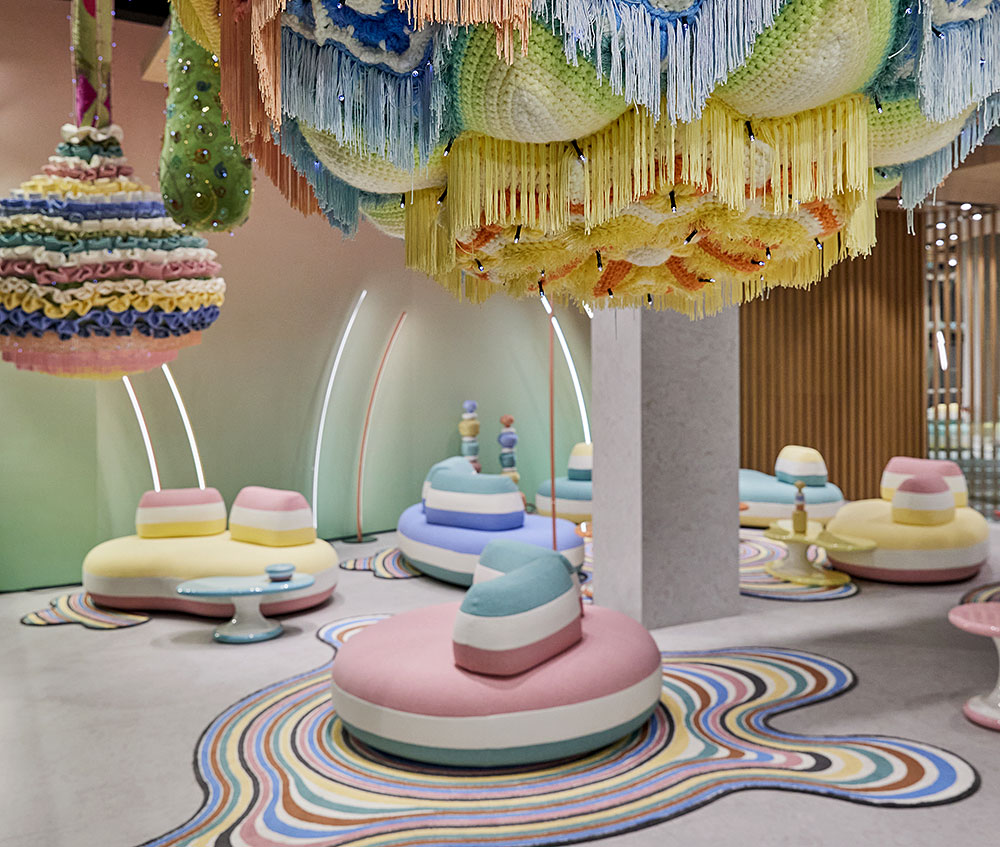 Joana Vasconcelos’s pastel-toned BomBom collection for Roche Boboi, with her hanging Valkyries sculpture. Courtesy of Salone del Mobile