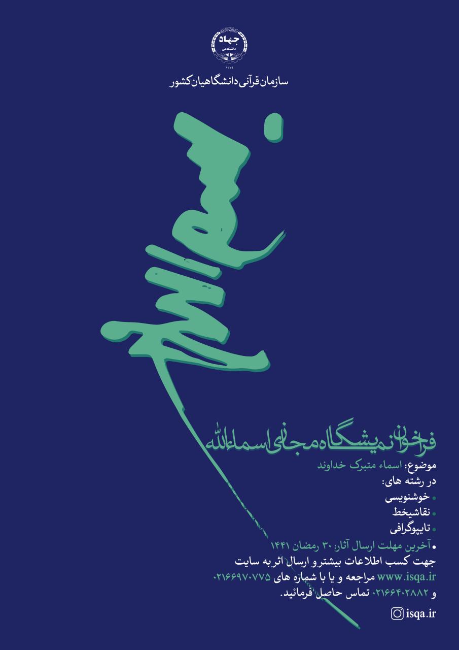 ازاينرو سازمان قرآني دانشگاهيان کشور وابسته به جهاد دانشگاهي فراخوان نمايشگاه خوشنويسي، نقاشيخط و تايپوگرافي با عنوان اسماءالله را منتشر مي کند.
