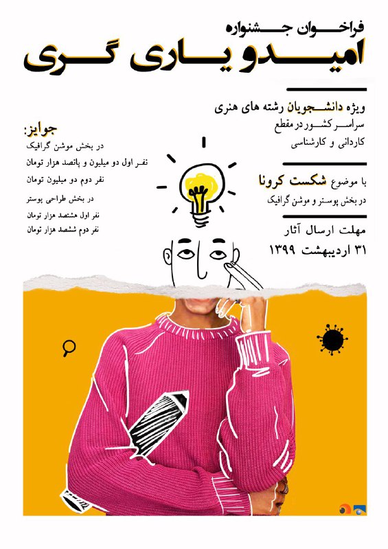 جشنواره مجازي اميد و ياري گري به همت دانشکده هنرهاي ديجيتال با همکاري معاونت فرهنگي دانشگاه صداوسيما با شروع سال جديد فراخوان خود را در بخش هاي موشن گرافيکس و پوستر با موضوعات شکست کرونا و جهش توليد منتشر کرد.