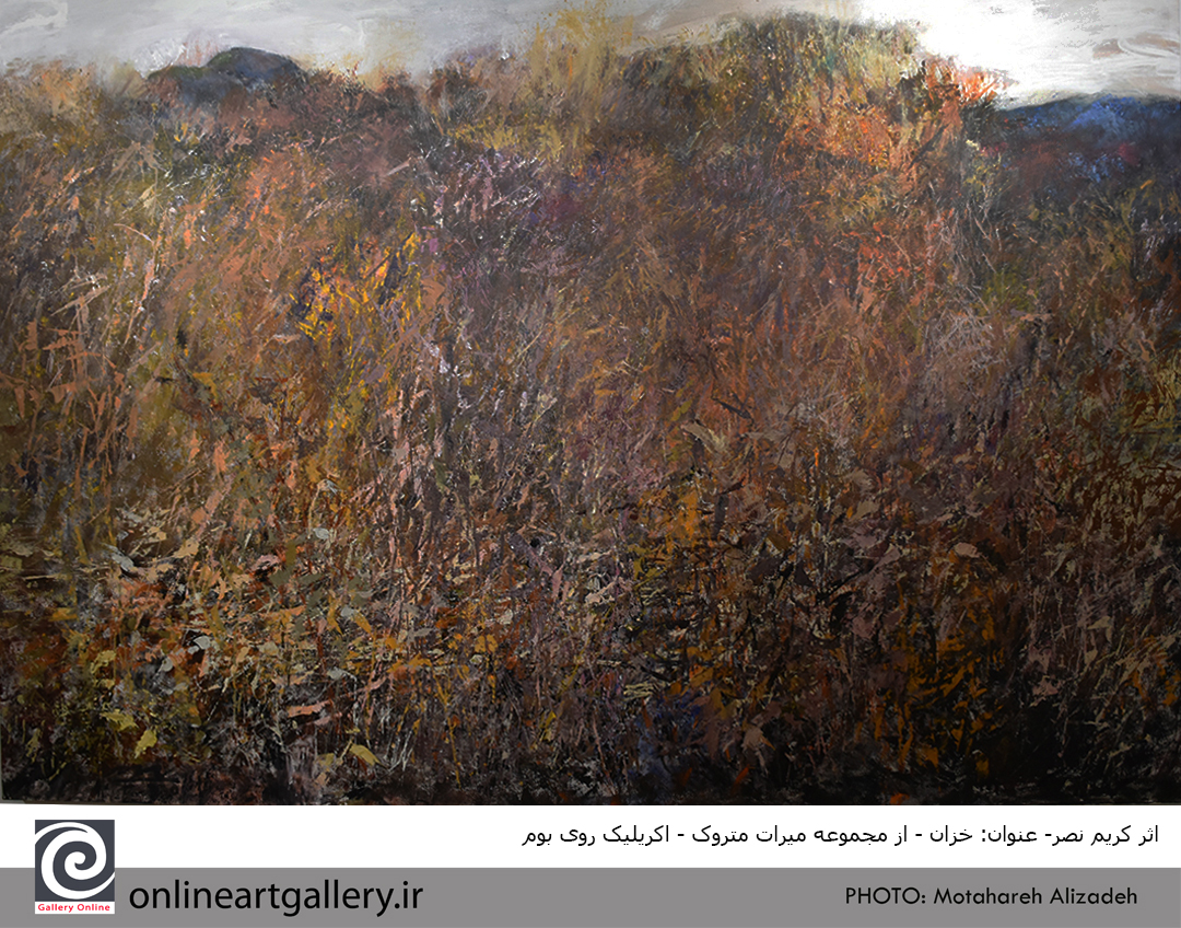 حالا کريم نصر از کشاکش و نسبت ميان اشيا و انسان ها که روايت مسلط نقاشي هاي او در طي چند دهه بوده، راه تازه اي يافته و پس از يک دوره طولاني تامل در روابط پيچيده و ساختارمند اشيا و آدم ها و کنشهاي اجتماعي و فرهنگي ميان آنها، قدم به قلمرو وسيع انتزاع و طبيعت (که در نهايت خود، عميقا شبيه به هم هستند) برداشته است. طبيعت آغوش خود را به طرف نصر باز کرده و او را به مرحله تازه اي از زندگي حرفه اي، و حتي به گمان من زندگي شخصي، فراخوانده است.