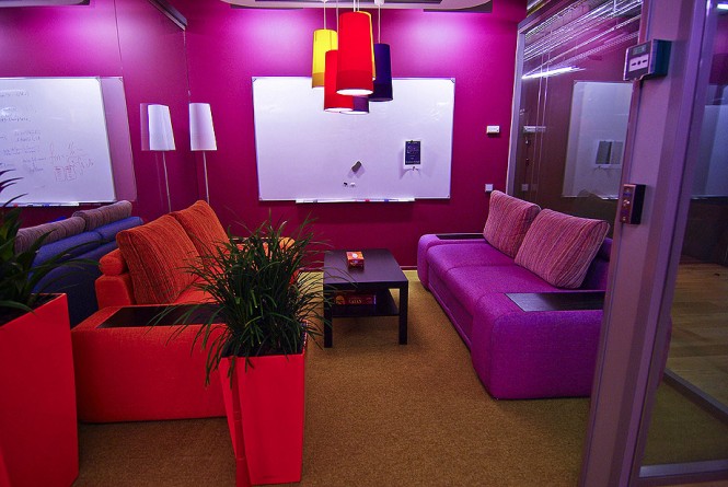 از آن ترکيب هاي دوست داشتني بسيار بامزه اي است که دل شما را مي برد، نياز نيست حتما در ترکيب رنگ فضايتان از يک رنگ در حجم زياد استفاده کنيد، همان طور که مي بينيد در اين فضا در کنار يک ديوار بنفش کم رنگ از کوسن هاي کوچک به رنگ هاي نارنجي استفاده شده که همين حجم کوچک از رنگ نارنجي تاثير خود را در فضا گذاشته است. و در اين ترکيب نسبتا سرد بنفش حضور همين حجم کم از رنگ نارنجي حس گرماي متعادلي را به فضا بخشيده است.