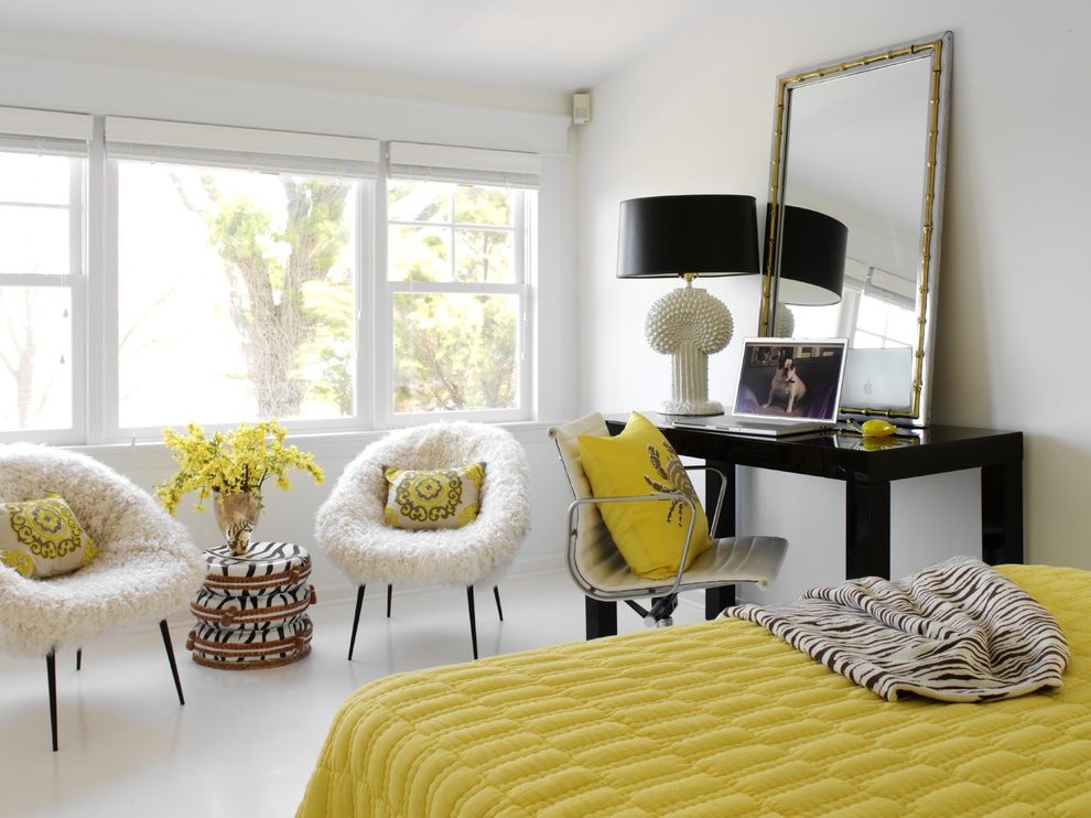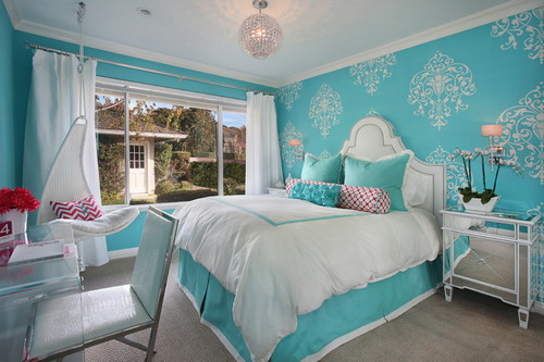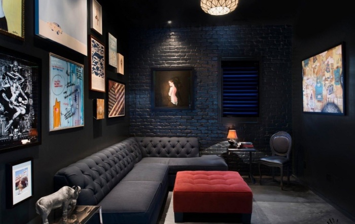 رنگ سياه در اين اتاق با ديوارهاي آبي آن غيره منتظره و شگفت انگيز است. گرماي خاصي به فضا ميدهد و کمي حس مردانه به آن ميدهد در صورتي که اين اتاق خواب .ميتوانست کاملا زنانه به نظر برسد ، حتي مشکي در کنار مبلمان آبيصحنه اي خاص به محيط ميبخشد . حضور تک مبل فيروزه اي در فضايي سياه توجه ها را در اين فضا معطوف خود کرده است و اصالت خاصي را در عين مدرن بودن به اين دکوراسيون ميدهد . پس در انتخاب تک رنگ ها با رنگ سياه، آبي فيروزه اي را فراموش نکنيد .