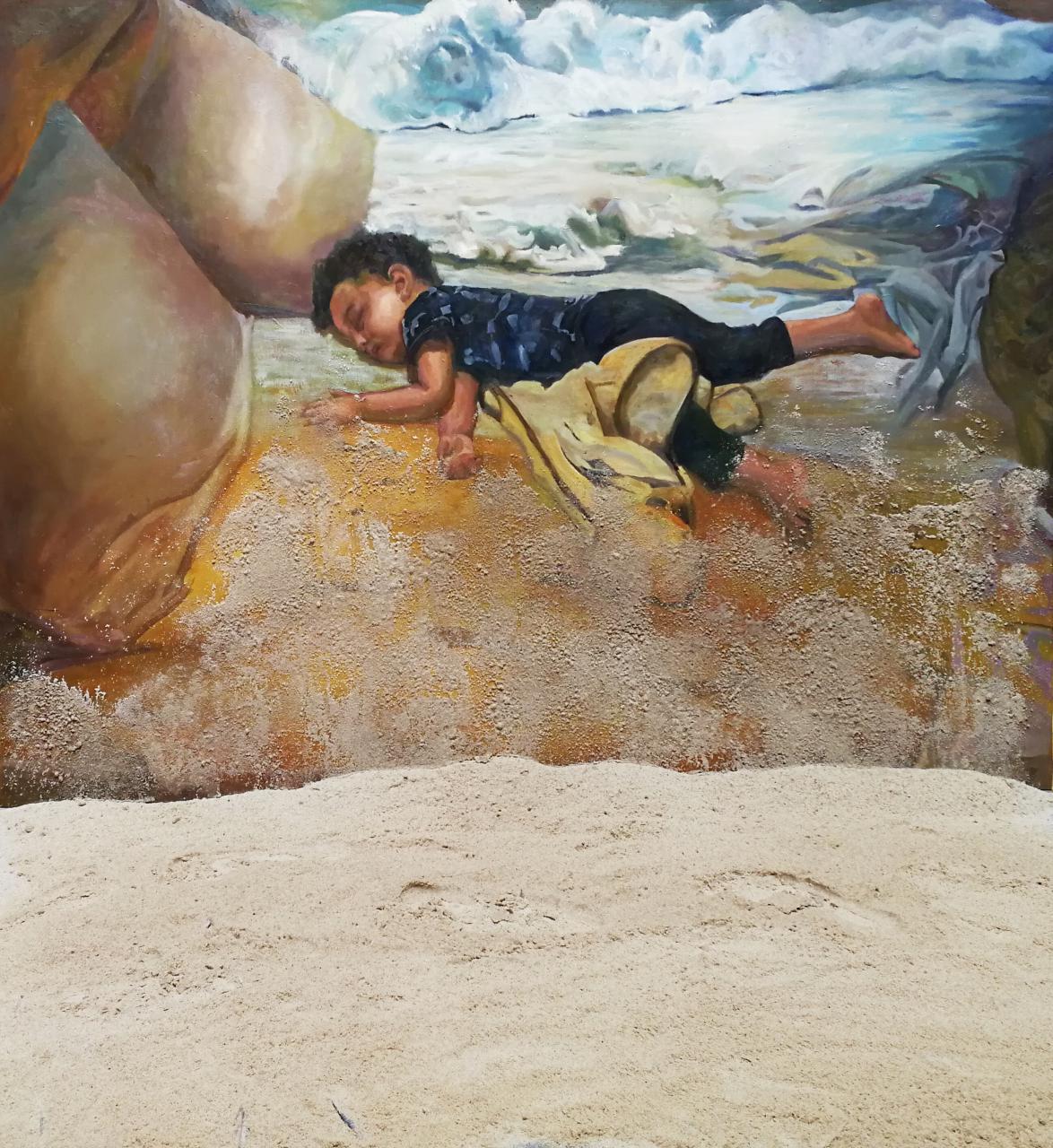 به طور کلي دريا و اقيانوسها يکي از موضوعات مورد علاقه من بوده است. دريا در کنار حس آرامش و عظمتي که به انسان ميدهد، با خود نوعي وحشت و ترس را نيز القا ميکند. در اين کار با توجه به رويکرد مورد نظر تلاش کرده ام تا ارتباطي بين اقيانوس و زندگي نسلهاي آينده ي انسان برقرار کنم. کودک ايستاده بر روي صندلي نماد نسل اينده ايست که بيگناه مورد خشم طبيعت قرار گرفته است . به نظر من زندگي ما ارتباط تنگاتنگي با طبيعت اطرافمان دارد. هر چقدر بيشتر مواظب و نگران سلامت طبيعت باشيم، زندگي امن تري را براي آيندگان خود رقم خواهيم زد.