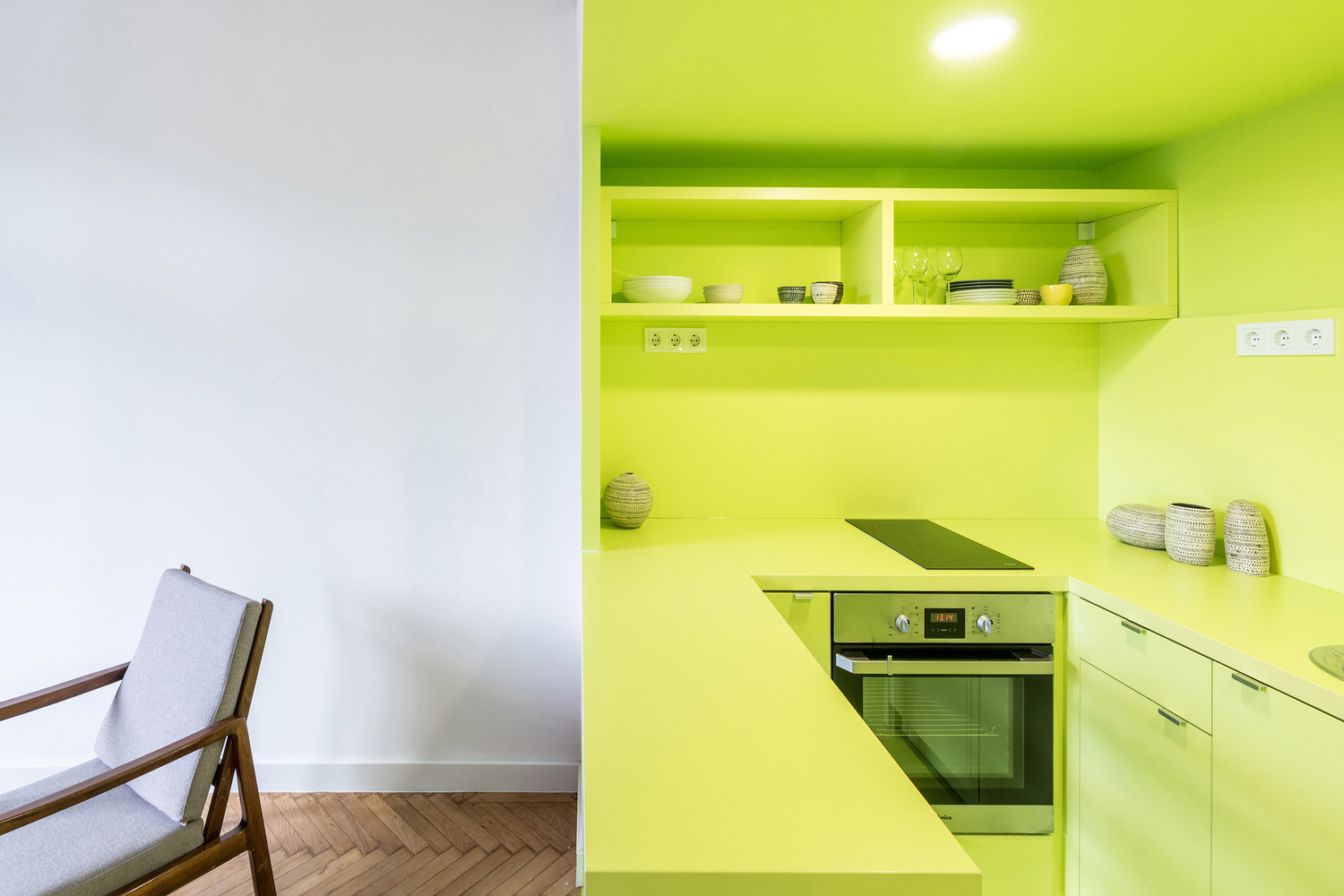 محوطه آشپزخانه 3in1 ، که توسط معماران batlab طراحي شده است ، با رنگ سبز پر جنب و جوش از کف به سقف يکپارچه شده است.