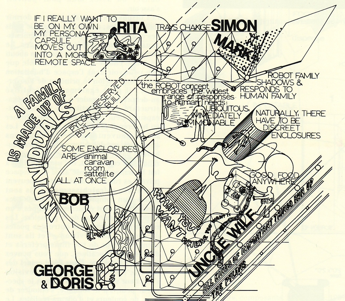 اگرچه در اين تصاوير تمرکز بيشتر بر روي فضاهاي شهري و جمعي است تا فضاي شخصي، اما همانطور که در نقشه نيز نشان داده شده، محل زندگي شخصي نيز هرگز ناديده گرفته نشده است. خانه هاي کپسولي 1964 (Capsule Houses)، مجموعه اي از خانه هاي پيش ساخته با قابليت مونتاژ آسان از شناخته شده ترين آنهاست. اين ماژول ها از سازه هاي مدور کوچک و متصل به ماکروسازه مرکزي تشکيل شده اند که ويژگي بارز پروژه Plug-In City (شهر اتصالات) به شمار مي رفت.