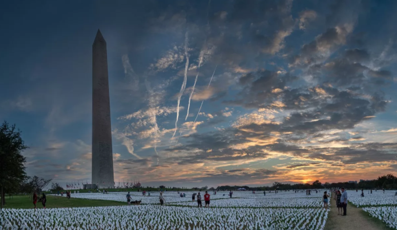 در پاييز امسال، در هجوم شيوع نوع دلتاي کوويد-19 در ايالات متحده، در کشوري که با سنگيني غم و اندوه جمعي غيرقابل درک، دست و پنجه نرم مي کند و با تبليغات مخرب ضد بهداشت عمومي مبارزه مي کند، هنرمند Suzanne Brennan Firstenberg، اثر تاريخي خود را در پروژه آمريکا در مرکز خريد ملي در واشنگتن دي سي نصب ميکند. مقدمه: فرستنبرگ و تيمي از همکارانش پرچمهاي سفيد کوچکي را به اندازه کف دست به طور دسته جمعي کاشتند که هر کدام نشان دهنده زندگي از دست رفته در اثر همهگيري کوويد-19 بود. پرچم ها روي سيم هاي نازک قرار گرفتند و با سوراخ کردن زمين، نصب شدند و به نوبه خود چمن شمالي اطراف بناي يادبود واشنگتن را پوشانده بودند.