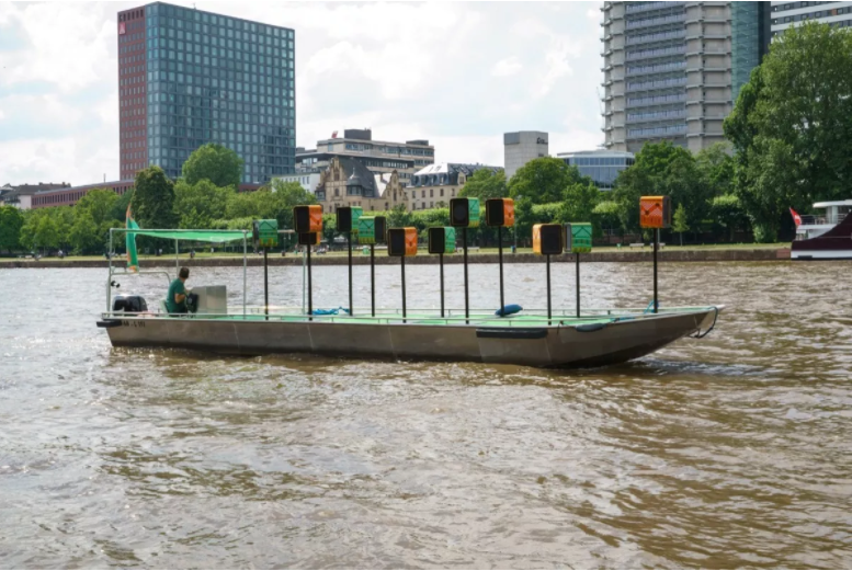 اين نيز بگزرد اثر Emeka Ogboh يک مداخله تلخ و موقت در داخل و سراسر فرانکفورت بود. لايهبندي پيچيده و خاطرهانگيز از صدا، حرکت، و نصب خاص سازه که فضاي شنيداري و فيزيکي را در سراسر شهر از جولاي تا اکتبر اشغال کرده بود. هنرمند از طريق بخش صوتي آکاپلا (که روي آب از طريق رودخانه مين بر فراز يک قايق حرکت مي کرد و سخنراناني با پارچه هاي بافته شده با اشاره به صنايع دستي ايگبو در خشکي تعريف مي کردند)، مي پرسد: آواز خواندن با هم در جامعه ما به چه معناست، به ويژه در دنيايي همه گير و بحران زده که موسيقي و هنر في نفسه مدت هاست ساکت شده اند؟
