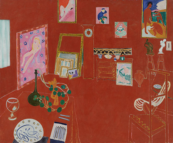 استوديوي سرخ، شش نقاشي، سه مجسمه و يک ceramic توسط Matisse را براي اولين بار از زماني که در استوديوي خود او جمع شده بودند، دوباره گردآوري مي کند و به نمايش ميگذارد. نقاشي که نمايشگاه نام خود را از آن مي گيرد، The Red Studio در سال ۱۹۱۱ ميلادي در حومه شهر پاريس در Issy-les-Moulineaux نقاشي شد و استوديوي خود Matisse را به تصوير مي کشد که پر از آثار گذشته اش است. در اين اثر نسخه هاي کوچکي از نقاشي هاي او روي ديوارهاي اتاق به چشم مي خورند که با رنگ قرمز زنگ زده کشيده شده اند. هيچ پنجره، يا دري يا چشم انداز بسياري وجود ندارد. خطوط ظريف سفيد رنگ گوشه هاي اتاق و يک ساعت پدربزرگ را نشان ميدهند. اما در اينجا، ساعت هيچ عقربه اي ندارد، نه زماني را نشان ميدهد و نه در خروجي را. با اين حال موفقيت Matisse در اين اثر غلبه بر پريشاني با گول زدن خود است؛ زمان به هر حال طولاني و ملالت آور است، و هنرِ براي تحسين وجود دارد.