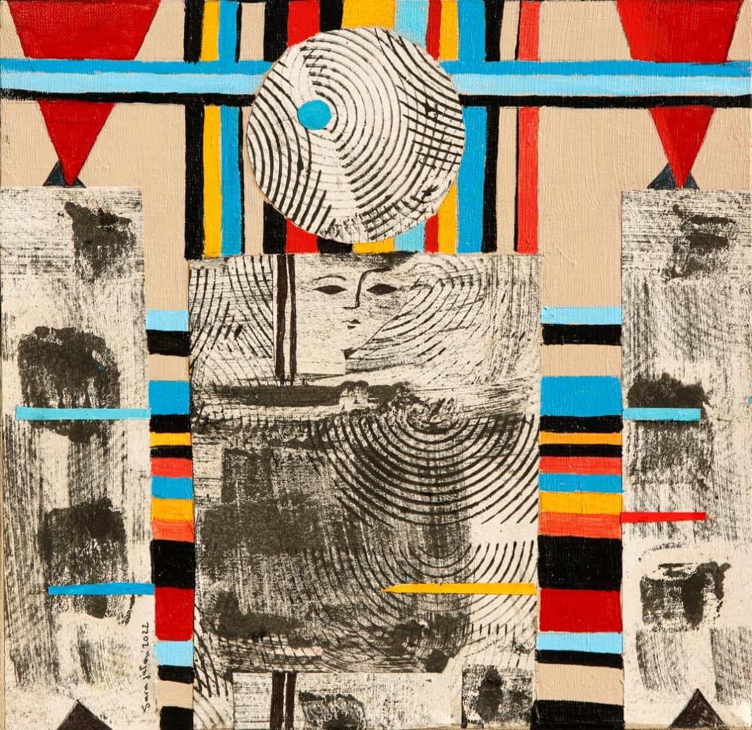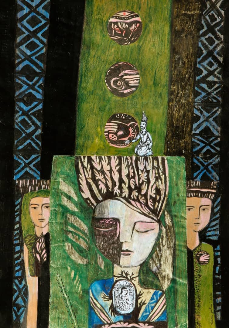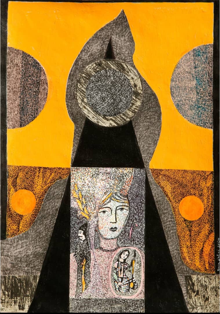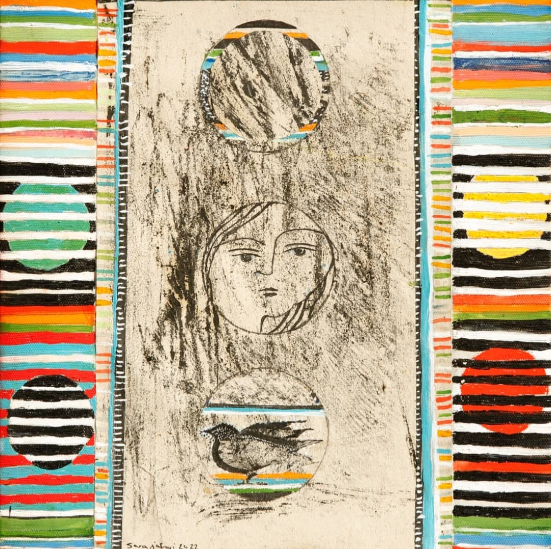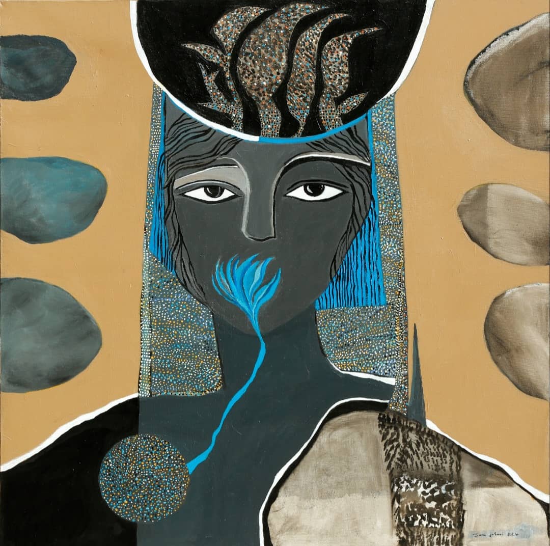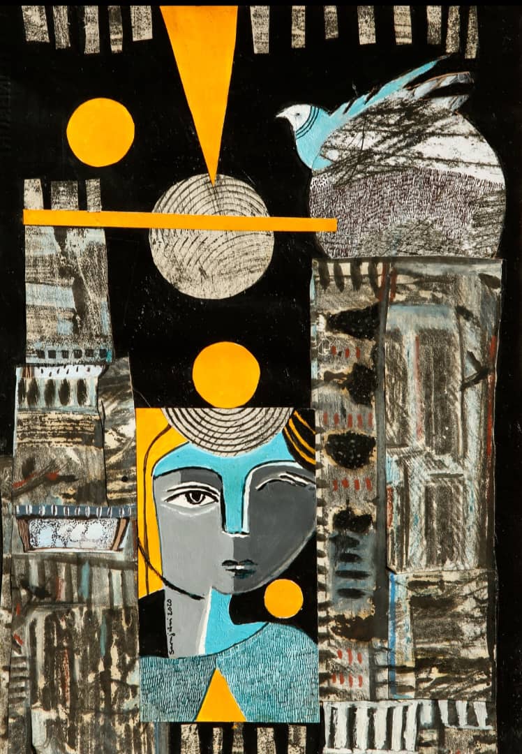 صورت هاي زنانه که يادآور هويت زنان ايراني هستند، از ميان سطوح هندسي و ترکيبهاي رنگي بيرون ميآيد، در عين لطافت، حضوري استوار و استعلايي دارد. چهرهاي که گاه در آرامش سطوح پناه گرفته و گاه با لبههاي تيز مثلثها در چالش است اما همچنان زيبايي و لطافت خود را حفظ کردهاند. گويي هنرمند با بهرهگيري از اين عناصر، تجربههاي زيسته خود را در قالبي استعاري به تصوير کشيده است. حضور زن در کنار نمادهايي چون ماه، درخت و پرنده، تأکيد بر پيوند ذاتي ميان انسان و طبيعت است.