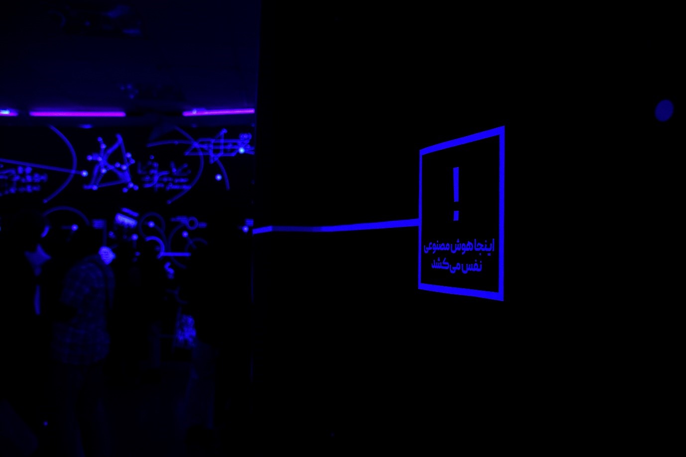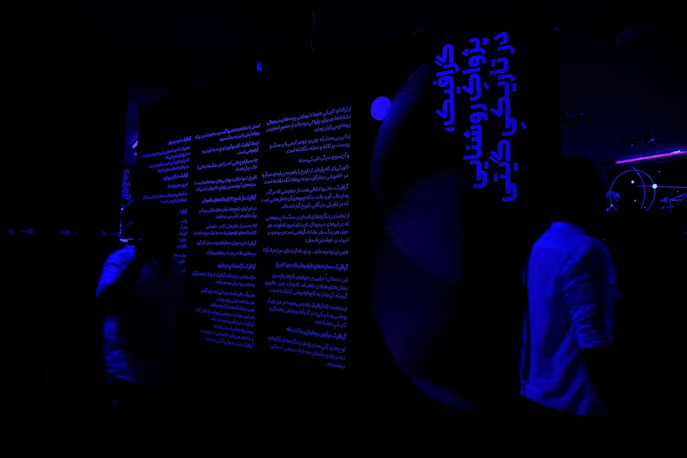 با ورود به سالني که در تاريکي فرو رفته و تنها ردّ نوري کمجان از لابهلاي خطوط معلق در فضا عبور ميکند، حس ميکني وارد زمان ديگري شدهاي. اينجا نه يک گالري، که انگار معبدي است براي نشانهها؛ جايي که تاريخ نه در قابهاي منظم، که در ميان لايههاي نور و سايه، در دل ديوارها و بلکلايتها پنهان شده.