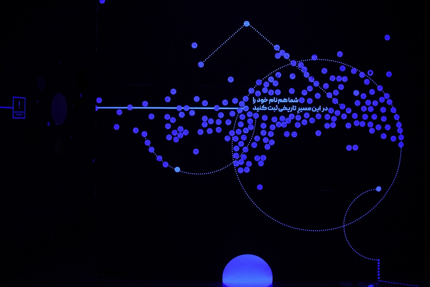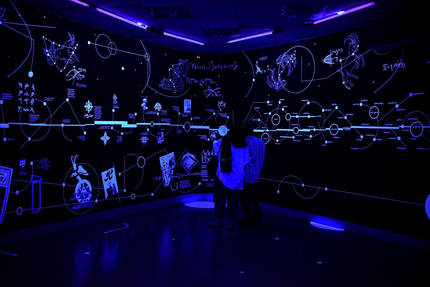 در طراحي چندلايه و پانوراماي نمايشگاه، ايده روايت افقي از آسمان تا زمين و از اسطوره تا داده، به شکلي هوشمندانه اجرا شده بود؛ فضايي که يادآور نظريات ميشل دوسرتو در «اختراع زندگي روزمره» است. او معتقد بود معنا در زندگي روزمره و از خلال مواجهه انسان با فضا و نشانهها ساخته ميشود. اين رويکرد در «تايملاين» نيز در فضاسازي تاريک، نورهاي موضعي، و خطوط معلق در هوا نمود داشت. مخاطب در هر قدم با نشانهاي مواجه ميشد که به يک برهه از تاريخ ارجاع ميداد؛ گاهي يک نماد کهن، گاهي يک فرم تايپوگرافيک، و گاه تصويري از تکنولوژيهاي معاصر. تجربهاي مشابه را ميتوان در پروژه «Future of Memory» (۲۰۱۸) در موزه هنرهاي معاصر وين مشاهده کرد؛ جايي که روايت حافظه تاريخي در فضايي سايهوار و چندلايه شکل گرفته بود.