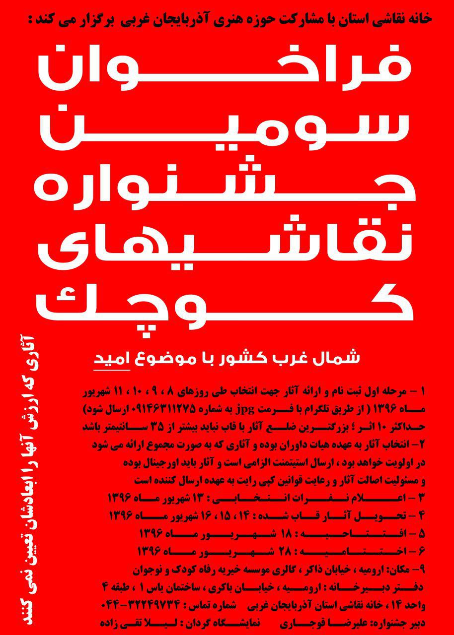 به گزارش گالري آنلاين به نقل از روابط عمومي جشنواره ، اين جشنواره که با همکاري خانه نقاشي و حوزه هنري انقلاب اسلامي آذربايجان غربي با موضوع "اميد" و با شعار "آثاري که ارزش آنها را ابعادشان تعيين نمي کنند" برگزار مي شود .