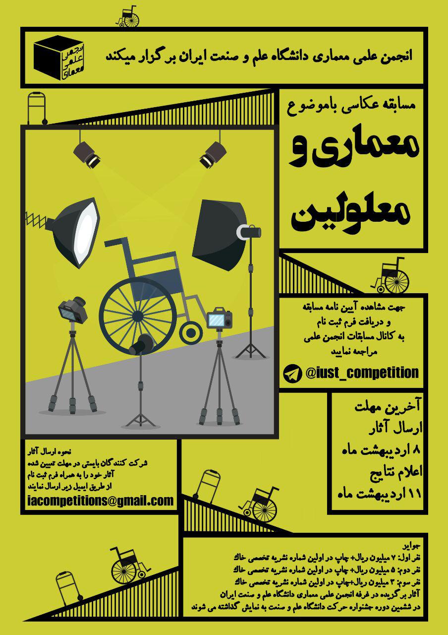 با اين مقدمه انجمن علمي معماري و شهرسازي دانشگاه علم و صنعت برآن شد تا با برگزاري مسابقه عکاسي «معماري و معلولين» موانع موجود براي اين افراد را بار ديگر يادآور شود و جامعه را بر آن دارد تا مدتي هرچند کوتاه به مشکلات آنان بينديشند.