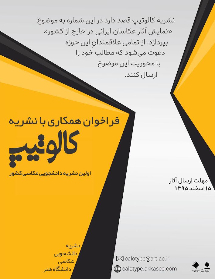 در ديماه ۱۳۸۵ اولين شمارهي نشريه کالوتيپ(نشريهي تخصصي عکاسي دانشگاه هنر تهران) به عنوان اولين نشريه دانشجويي عکاسي کشور، منتشر شد. اکنون با گذشت ۱۰سال از اولين روزهاي تولدش، در حال تدوين شمارهي جديد آن هستيم. قصد داريم در اين شماره، پروندهاي با موضوع «نمايش آثار عکاسان ايراني در خارج از کشور» داشته باشيم.