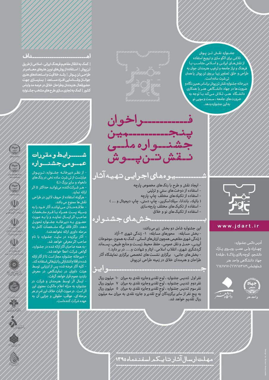 به اطلاع ميرساند ،پنجمين دوره "جشنواره ملي نقش تن پوش"، با همکاري دانشگاههاي هنري کشور، با اهدافي همچون کمک به انتقال مفاهيم فرهنگ ايراني ـ اسلامي از طريق تن پوش، رشد خلاقيت و استعدادهاي هنري و شناسايي افراد مستعد، در اسفند ماه سال 95 برگزار مي گردد.