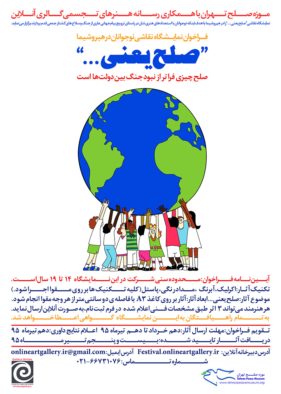 آثار نقاشي نوجوانان 14 تا 19 سال در نمايشگاهي که به مناسبت بمباران اتمي هيروشيما در ژاپن در کنار جشنواره فيلمي که به همين مناسبت برگزار خواهد شد به نمايش در مي آيد و علاقه مندان به شرکت در اين نمايشگاه ميتوانند آثار خود را به صورت آنلاين از طريق سايت دبيرخانه جشنواره به آدرس …… از تاريخ دهم خرداد ماه تا دهم تير ماه سال 95 ارسال نمايند.