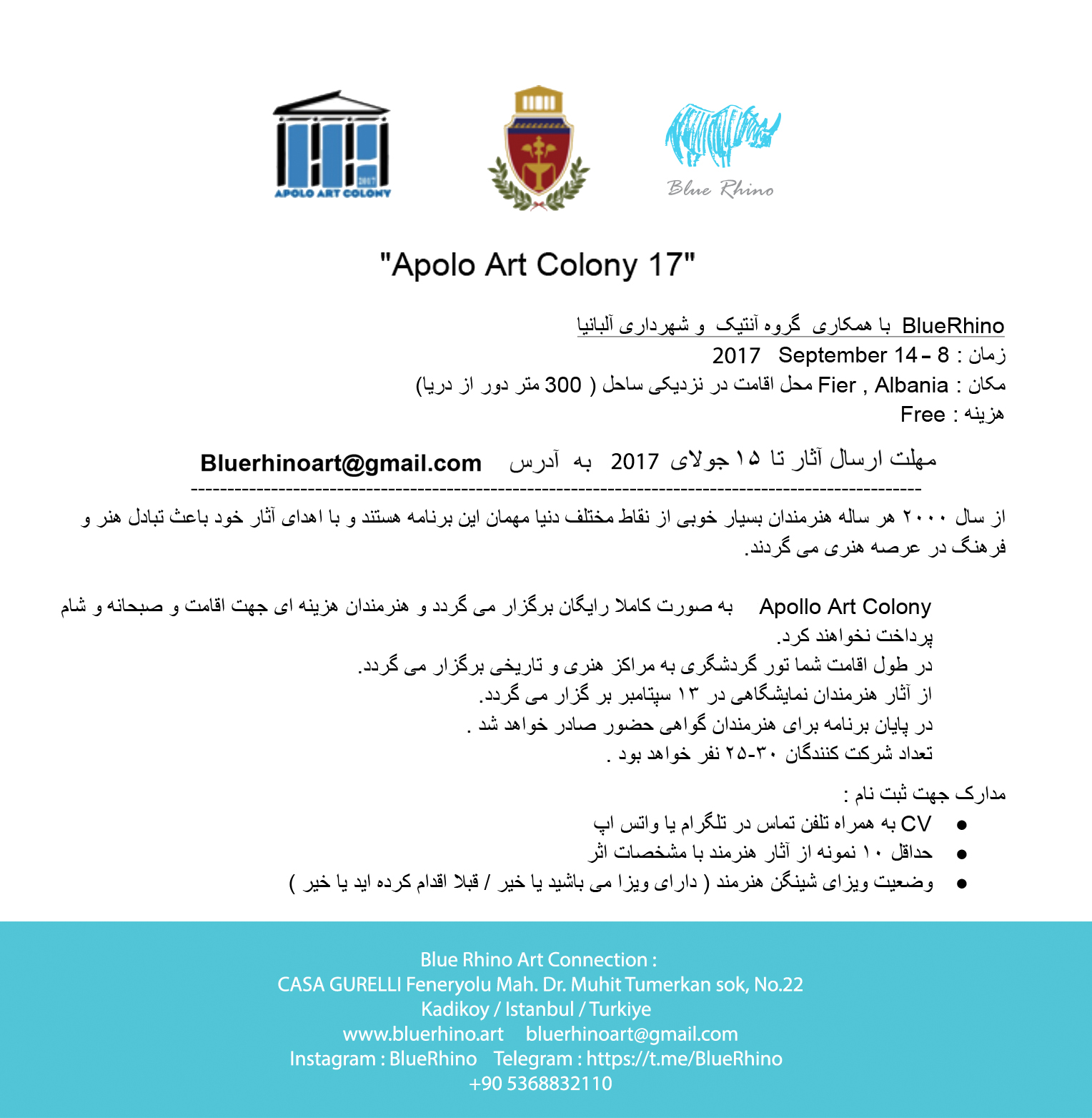 موسسه BlueRhino با همکاري گروه آنتيک و شهرداري آلبانيا فراخوان هنرتجسمي "Apolo Art Colony 17" را برگزار ميکند.