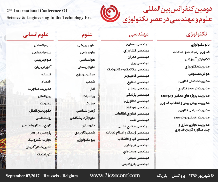 باتوجه به اهميت دانش علوم ، تکنولوژي و مهندسي در راستاي تحقق اهداف ، نياز به کارعلمي در ابعاد مختلف آن در سطح بين الملل وجود دارد. از اين رو ، برگزاري دومين کنفرانس بين المللي علوم و مهندسي در عصر تکنولوژي با هدف هم افزايي دانش و انتشار يافته هاي نو و بديع در زمينه هاي مختلف علوم ، تکنولوژي و مهندسي در تاريخ 16 شهريورماه 1396 مطابق با 7 سپتامبر 2017 با هدف آشنايي و ارتباط ميان اساتيد ، پژوهشگران ، صاحب نظران ، متخصصان و علاقمندان به منظور تبادل جديدترين دستاوردهاي علمي و تجارب کاربردي و بررسي چالشهاي علمي واجرايي در فرايند کاربرد آن از تمام مناطق جغرافيايي ، در سطوح محلي ، ملي ، منطقه اي و بين المللي با مشارکت دانشگاه هاي بين المللي و مراکز علمي ، پژوهشي در بروکسل – بلژيک برگزار مي گردد.