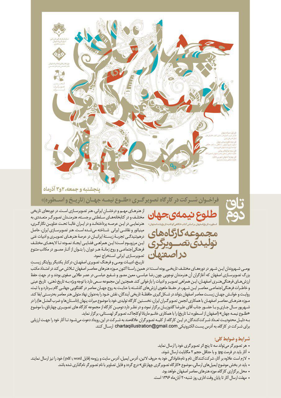موزه هنرهاي معاصر اصفهان با همکاري انجمن تصويرگران ايران، نخستين كارگاه توليدي خود با موضوع ميراث پنهان (داستان ها و ضرب المثل ها) را در شهريور سال جاري و با حضور جناب آقاي عليرضا گلدوزيان برگزار نمود، و در نظر دارد دومين كارگاه از مجموعه كارگاه هاي تصويري چهارتاق، با موضوع «طلوع نيمه جهان» (اصفهان از اسطوره تا تاريخ) را با همکاري خانم ماريانا اوکلِجاک، تصويرگر لهستاني، برگزار نمايد.