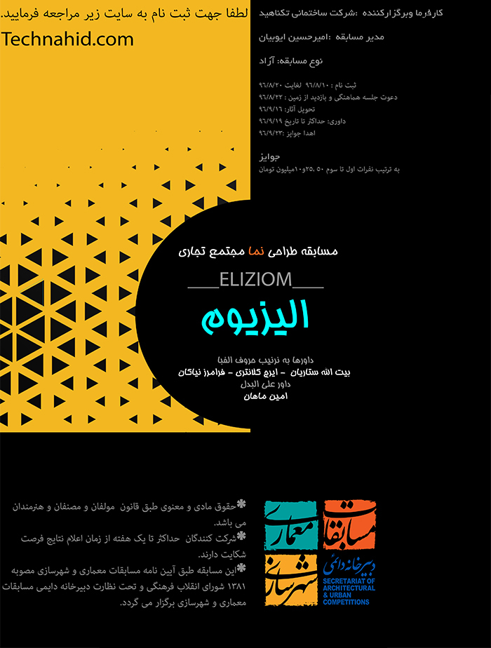 - اين مسابقه به استناد آيين نامه جامع برگزاري مسابقات معماري و شهرسازي (مصوب شوراي انقلاب فرهنگي) و تحت نظارت دبيرخانه دائمي مسابقات معماري و شهرسازي برگزار مي گردد.