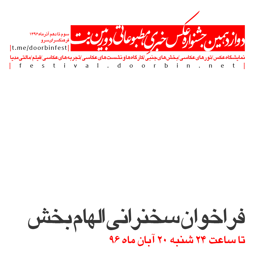 عزيزان متفاضي لطفا عنوان سخنراني، چکيده اي از سخنراني و رزومه اي از خودشان را تا تاريخ شنبه ۲۰ آبان ماه ۱۳۹۶ به آدرس ايميل doorbin.net@gmail.com ارسال کنند.