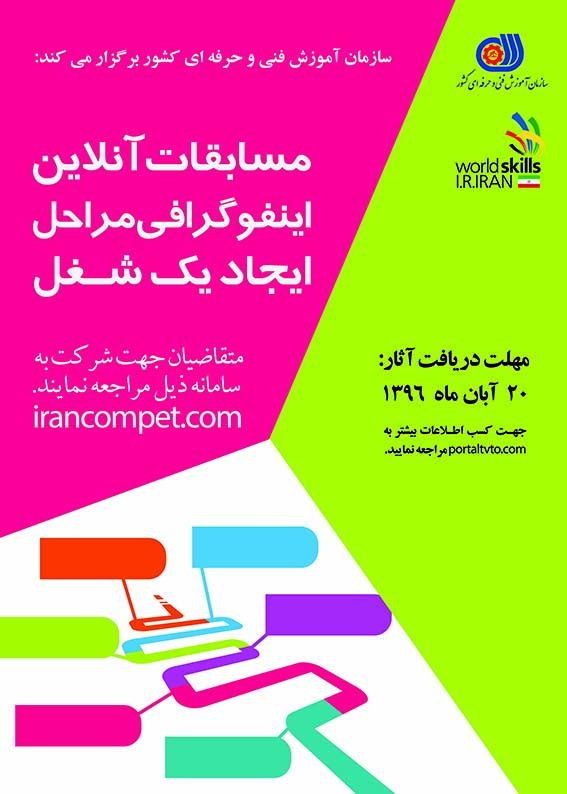 به گزارش گالري آنلاين به نقل از روابط عمومي ايران کامپت، سازمان آموزش فني و حرفه اي کشور از تمامي علاقه مندان ، دانشجويان ، مربيان ، کارآموزان ، آموزشگاههاي آزاد فني و حرفه اي و همکاران ستادي و استاني براي شرکت در مسابقه اينفوگرافي مراحل ايجاد يک شغل (کارآفريني) دعوت بعمل مي آورد.