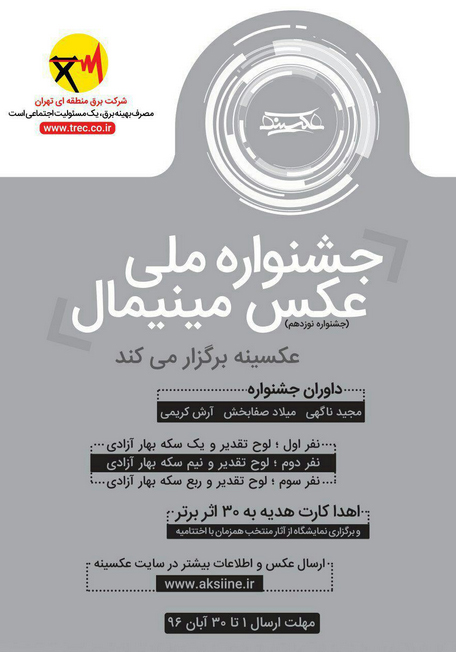 به گزارش گالري آنلاين به نقل از روابط عمومي جشنواره، موسسه عکسينه با همکاري شرکت برق منطقه اي تهران جشنواره ملي عکس مينيمال را برگزار ميکند .