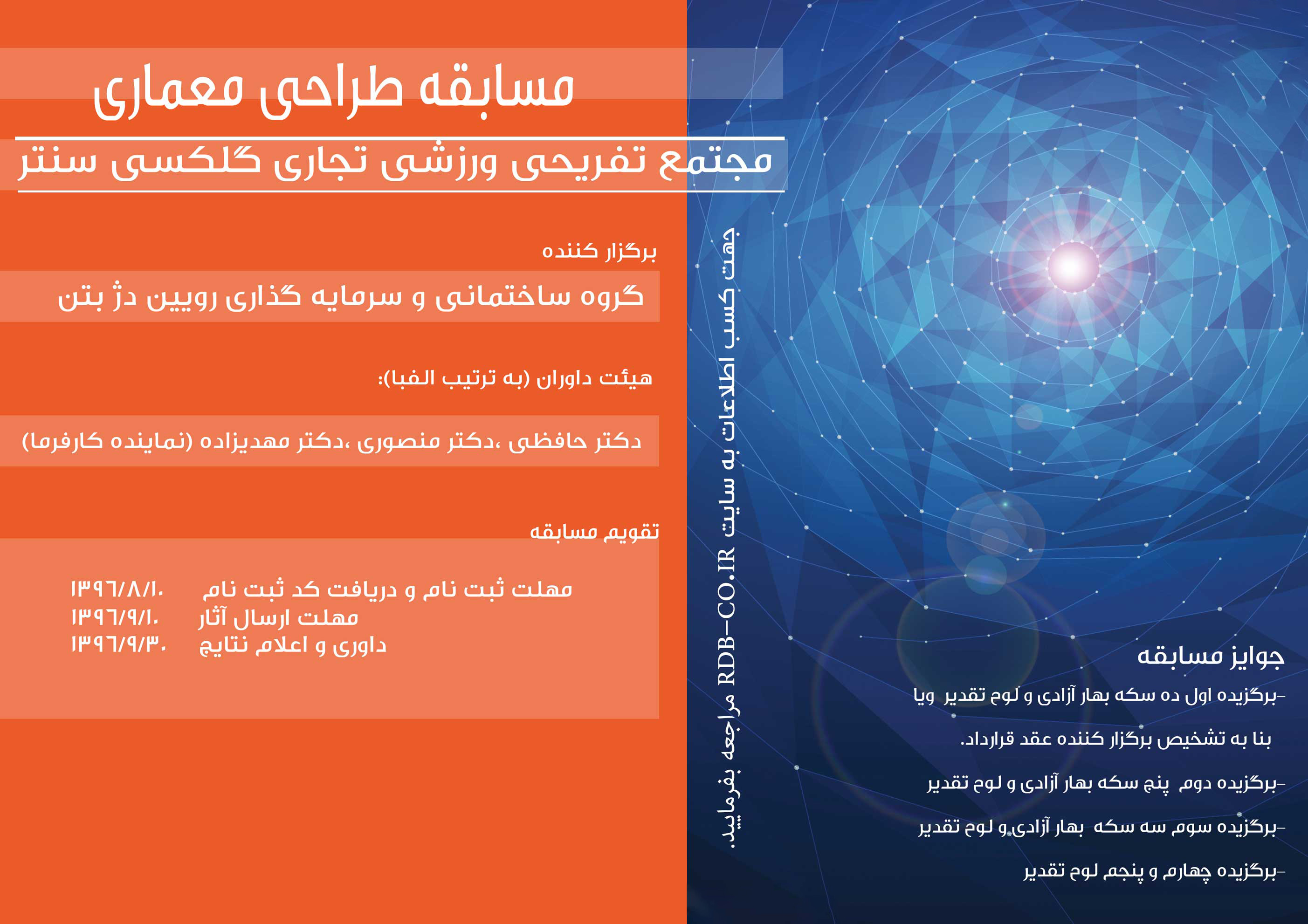به گزارش گالري آنلاين به نقل از معمارنيوز، شرکت ساختماني سرمايه گذاري رويين دژ بتن مسابقه طراحي مجتمع تفريحي، ورزشي و خدماتي GALAXY CENTER را برگزار مي نمايد.