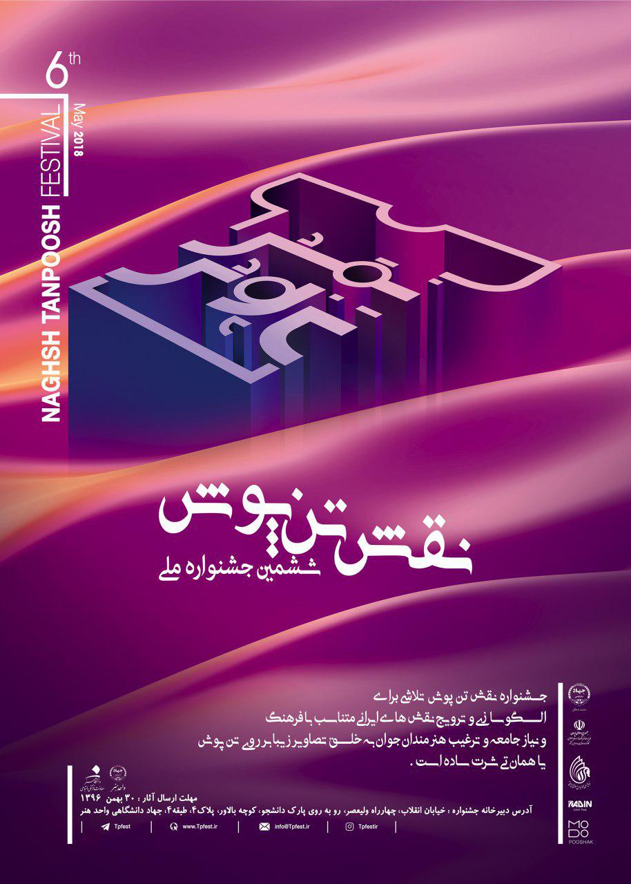 ششمين دوره جشنواره "نقش تن پوش" در دو بخش 1- اصلي: مسابقه طراحي تيشرت با محوريت تمدن ايراني، مسابقه طراحي تيشرت با موضوع آزاد 2- جانبي: